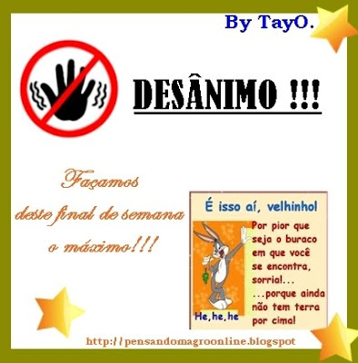 Oi, Tay, continuo firme na dieta mesmo depois da virose. Ontem, fiquei tanto do computador que esqueci de comer. O dia todo, só, tomei café da manhã básico e um cachorro quente a noite, quando o estômago começou a roncar, aí...nem postei...estou pegando dicas no site da Van...sobre o livro pense magro e emagreça e imprimo, depois passe por lá...bjs...estamos aí.